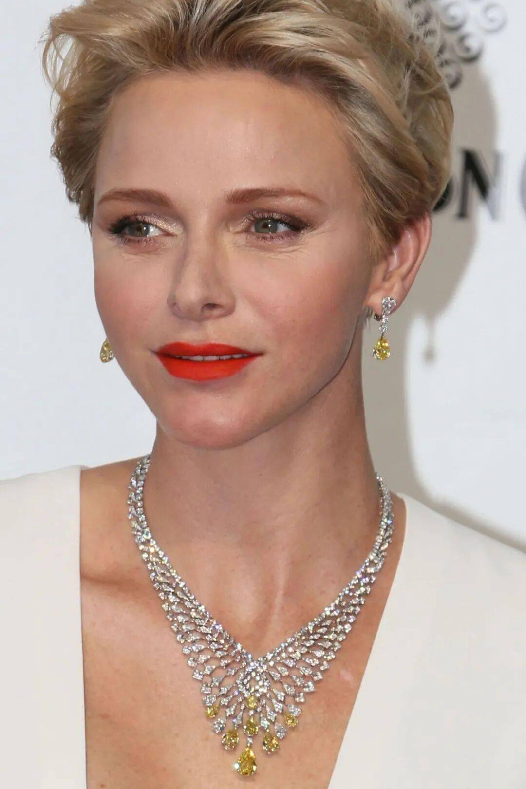 在蒙特卡洛格里马尔迪论坛举行的第56届蒙特卡洛电视节开幕式上,夏琳王妃再度以黄钻珠宝成为全场焦点。她佩戴了一套 Cartier 卡地亚黄钻与白钻项链,并搭配同系列耳环亮相,红唇点睛,为整体造型注入鲜明而自信的张力。