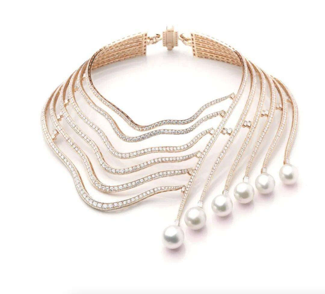 当时在婚礼庆典中亮相的,还有这条“无限瀑布项链”(Infinite Cascade Necklace)。该作品由贝鲁特珠宝世家塔巴Tabbah 打造,以玫瑰金为基底,镶嵌钻石与珍珠,整体线条流动而富有层次。