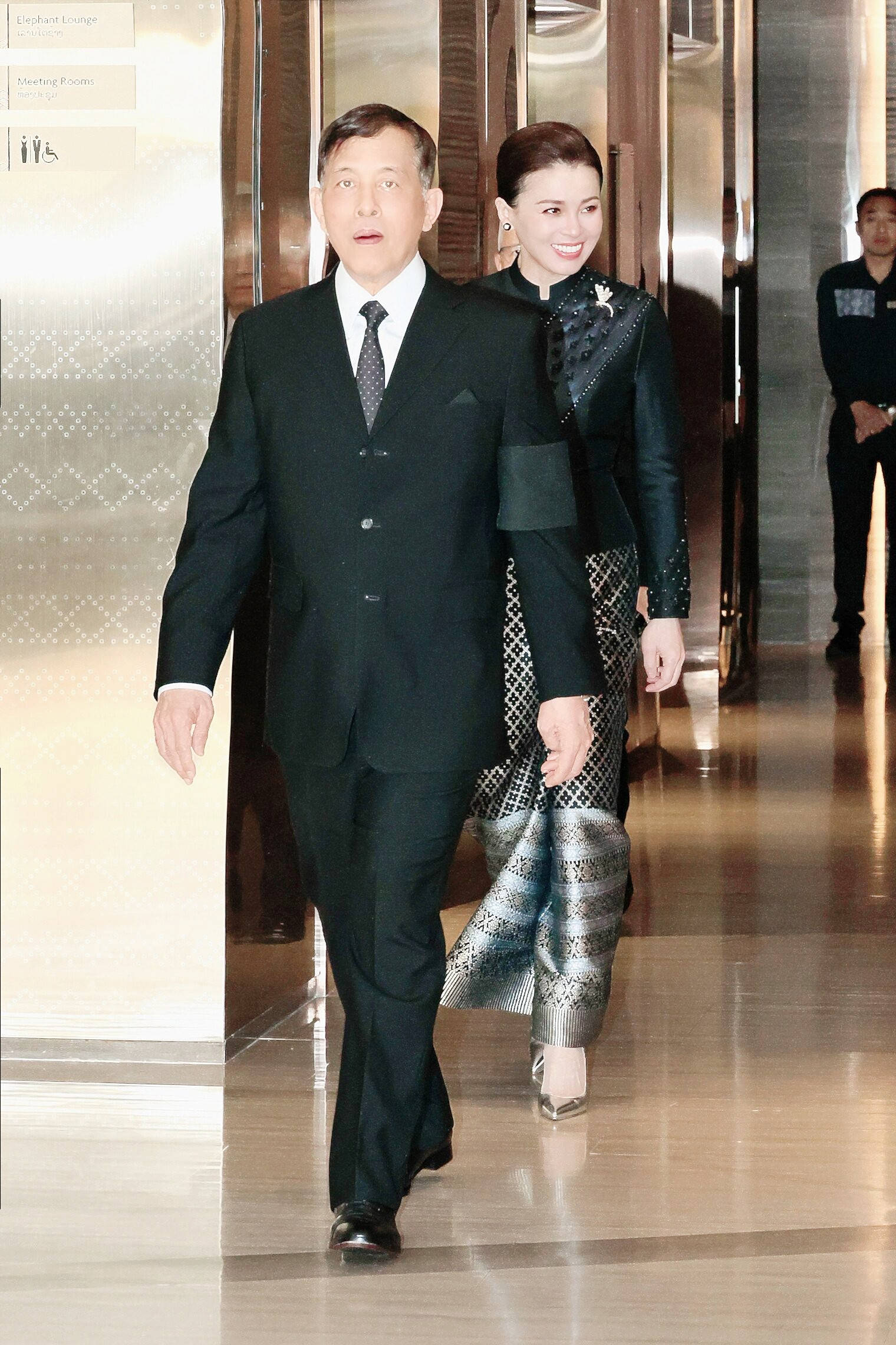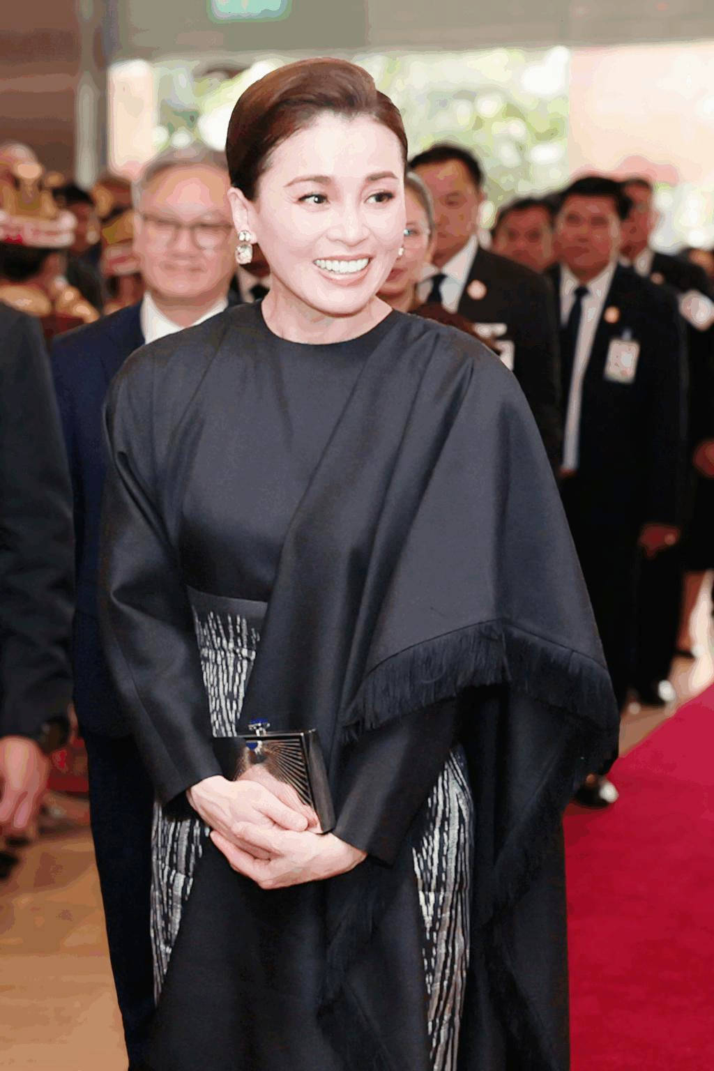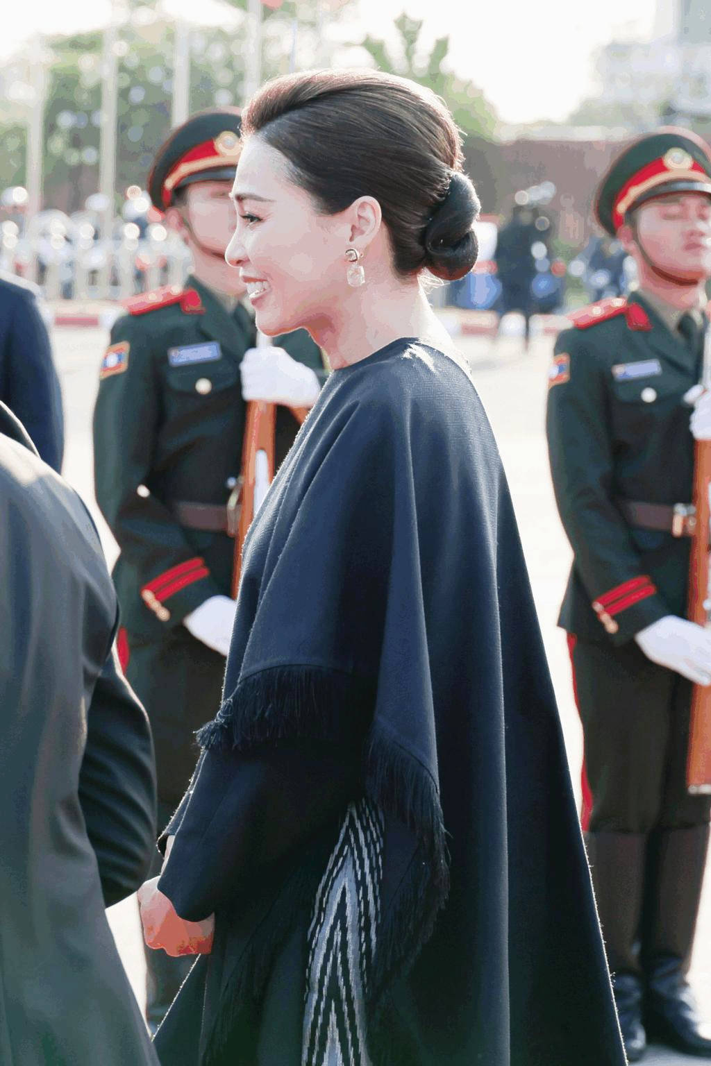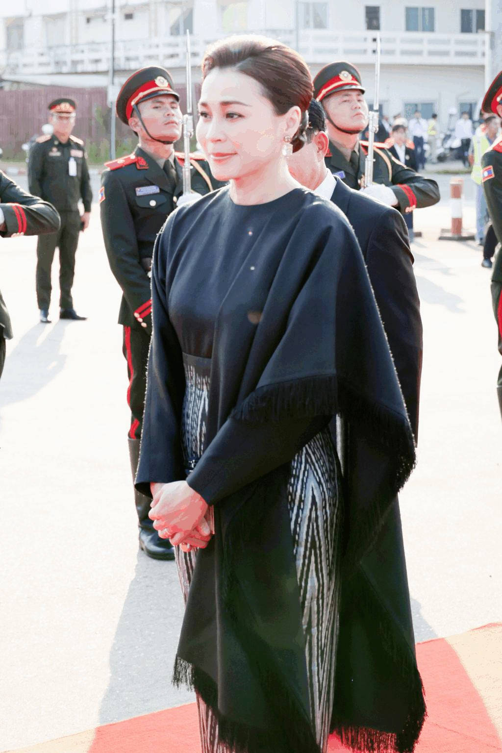 在老挝举行的欢迎仪式上,苏提达王后身着一袭黑色泰丝礼服,以极致的质感彰显王室高贵,同时传承泰国非物质文化遗产。
