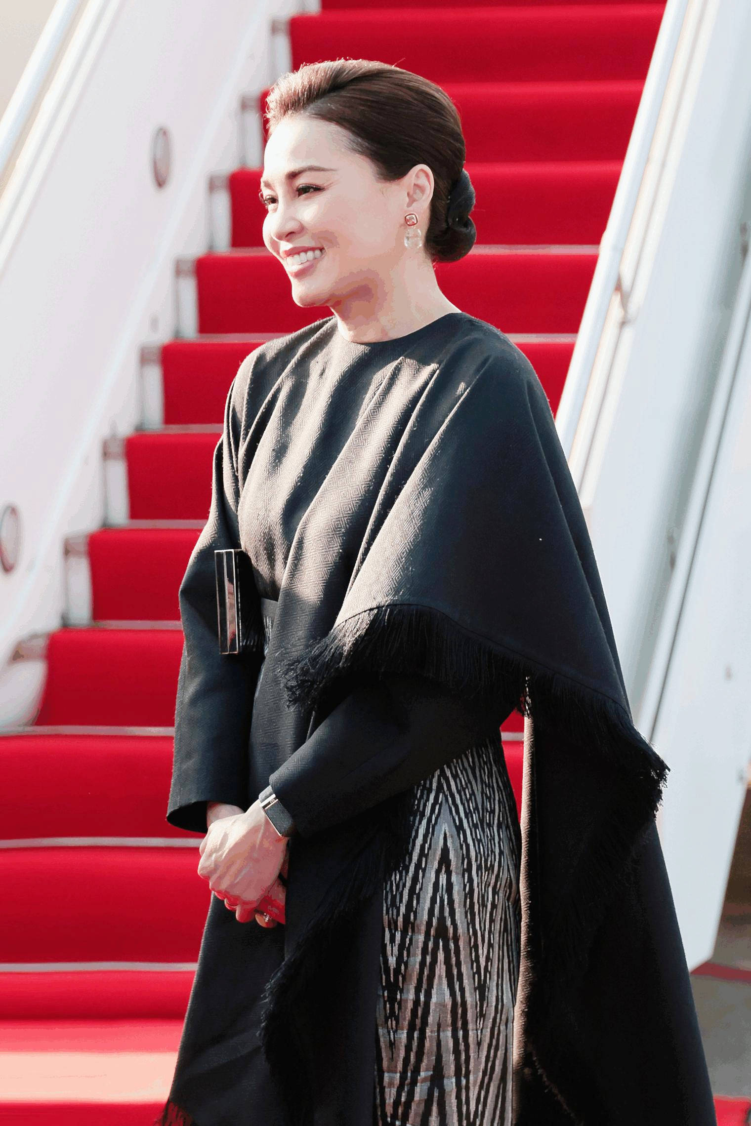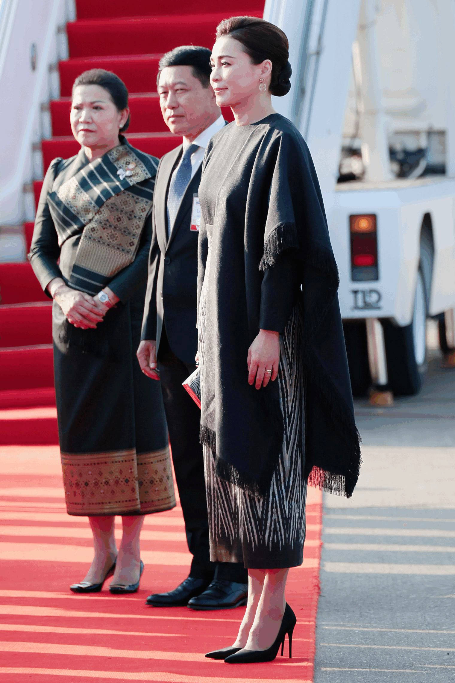 抵达老挝瓦岱国际机场时,苏提达王后身着的斗篷裙,是传统泰式元素与现代时尚设计的完美碰撞。裙摆融入泰国传统服饰的纹样元素,细腻的刺绣勾勒出泰式美学的精致,彰显了泰国传统文化的深厚底蕴;而斗篷的设计则极具现代感,线条流畅、版型大气,既修饰了身形,又增添了几分霸气,打破了传统泰服的刻板印象。