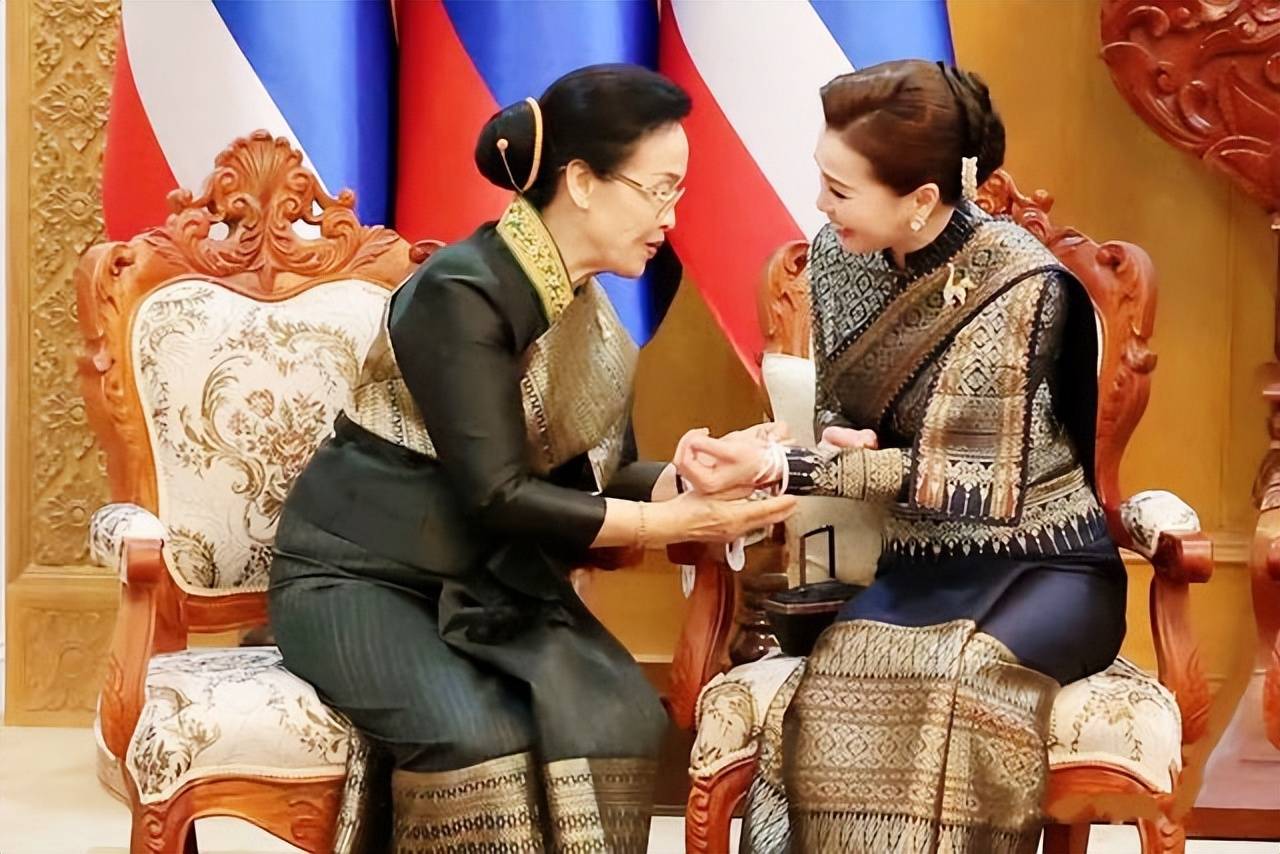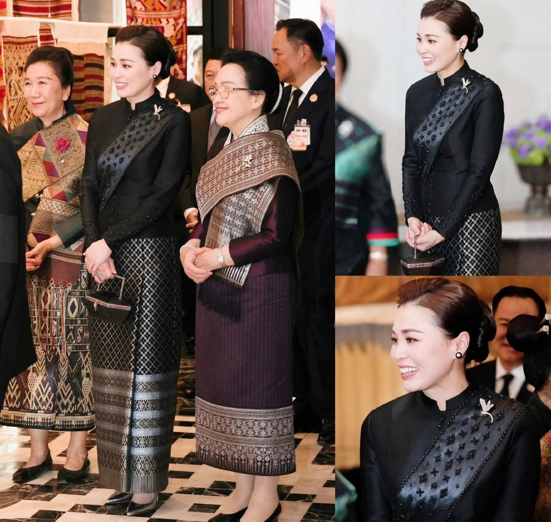 在老挝传统拴线祈福仪式上,苏提达王后的穿搭则体现了对东道主文化的尊重与共鸣,将泰式美学与老挝元素巧妙融合。