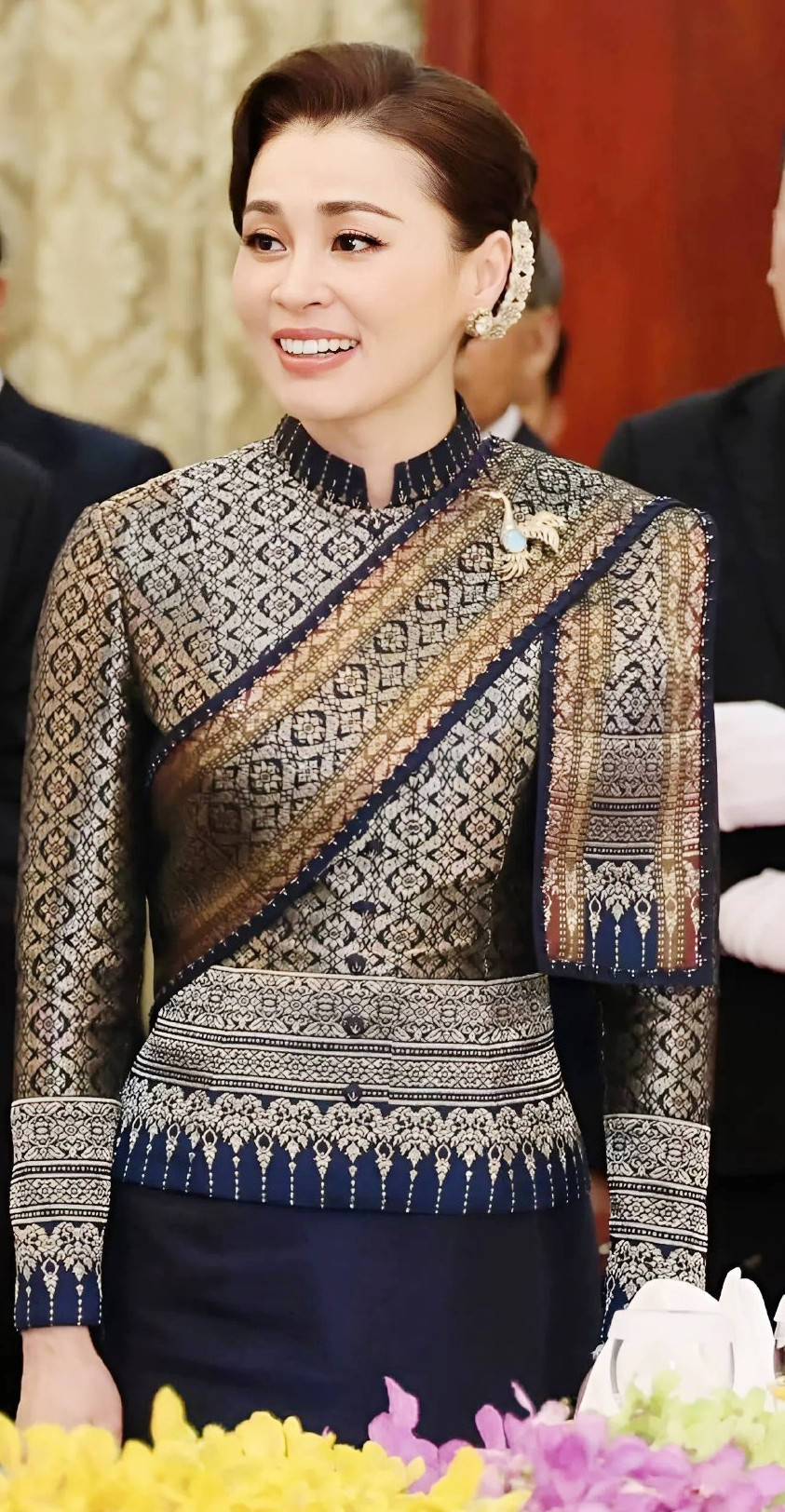 她身着的礼服在纹样设计上特意呼应了老挝传统图案,线条柔和、色彩协调,既保留了泰式礼服的精致,又融入了老挝文化的质朴,实现了两种文化的温柔碰撞。
