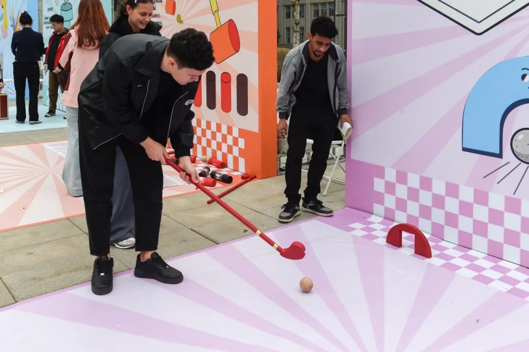 传统游戏区热闹非凡,欻嘎拉哈的清脆声响里,留学生们跟着志愿者学习翻抛技巧,在欢声笑语中触摸中国北方民俗温度;锤丸场上,大家手持球杆躬身推杆,体验古人“高尔夫”的雅致乐趣。