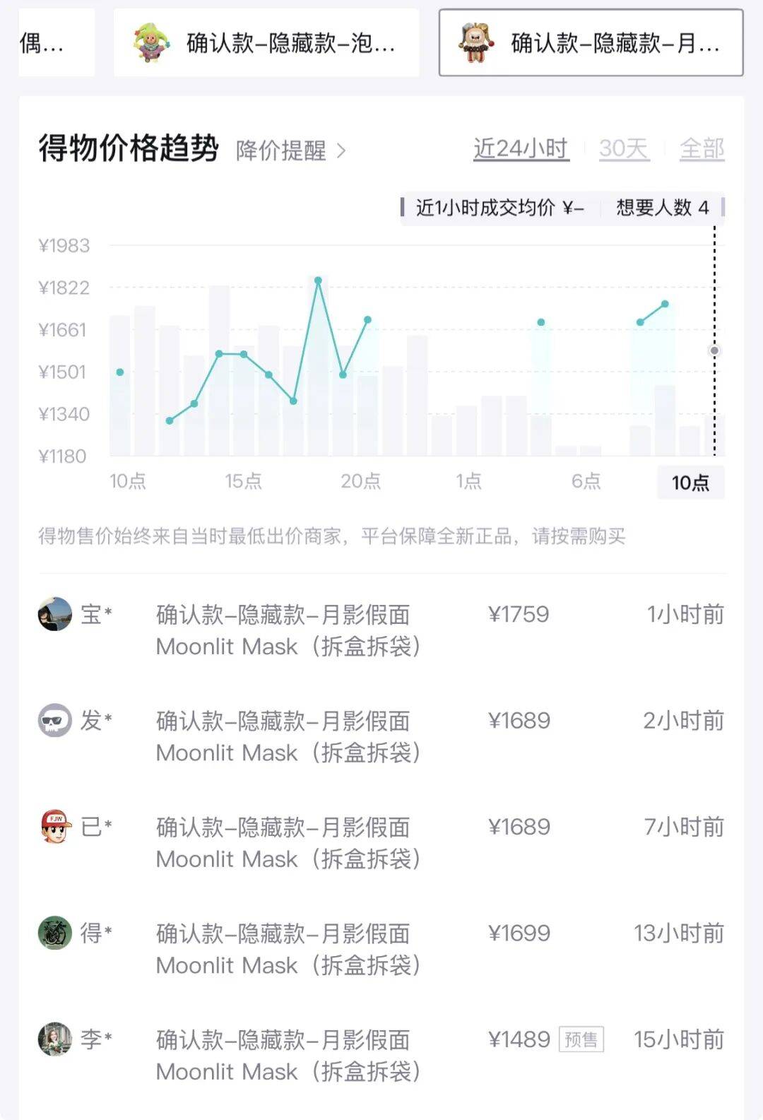 得物平台数据显示,以LABUBU为原型的大隐藏“月影假面”价格由159元升至峰值成交价2289元,溢价13.4倍;以星星人为原型的小隐藏“泡泡糖”商家出价为1569元,溢价9倍;在常规款中,以LABUBU为原型的“抛球小丑”、以DIMOO为原型的“炽焰小丑”、以星星人为原型的“彩虹豆丁”也受到追捧,分别溢价7.2倍、3.8倍和2.8倍。此外,未拆盒的单个盲盒价格由159元升至309元,溢价0.9倍,整盒价由1272元升至2199元,溢价0.7倍。