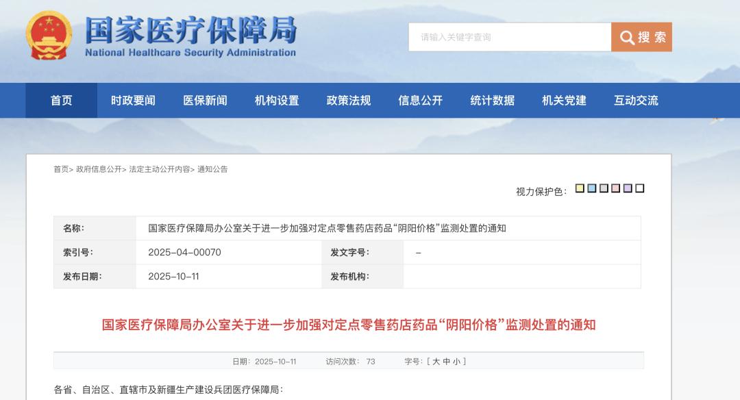 10月11日,据国家医保局网站消息,国家医保局日前发出通知,要求严肃查处定点零售药店药品“阴阳价格”问题,定点药店不得对医保参保人员实行不公平、歧视性价格。为进一步,国家医疗保障局办公室做出了相关要求:一,高度关注定点药店“阴阳价格”问题线索;二,严肃核查处置“阴阳价格”问题;三、做好常态化监测治理。