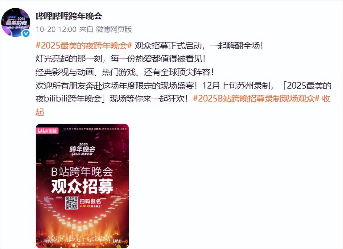 近日,哔哩哔哩官方微博宣布,2025年《最美的夜Bilibili跨年晚会》将于12月上旬在苏州进行录制。活动目前已经启动现场观众招募,届时将带来经典影视与动画作品、热门游戏以及全球顶尖阵容的精彩演出。