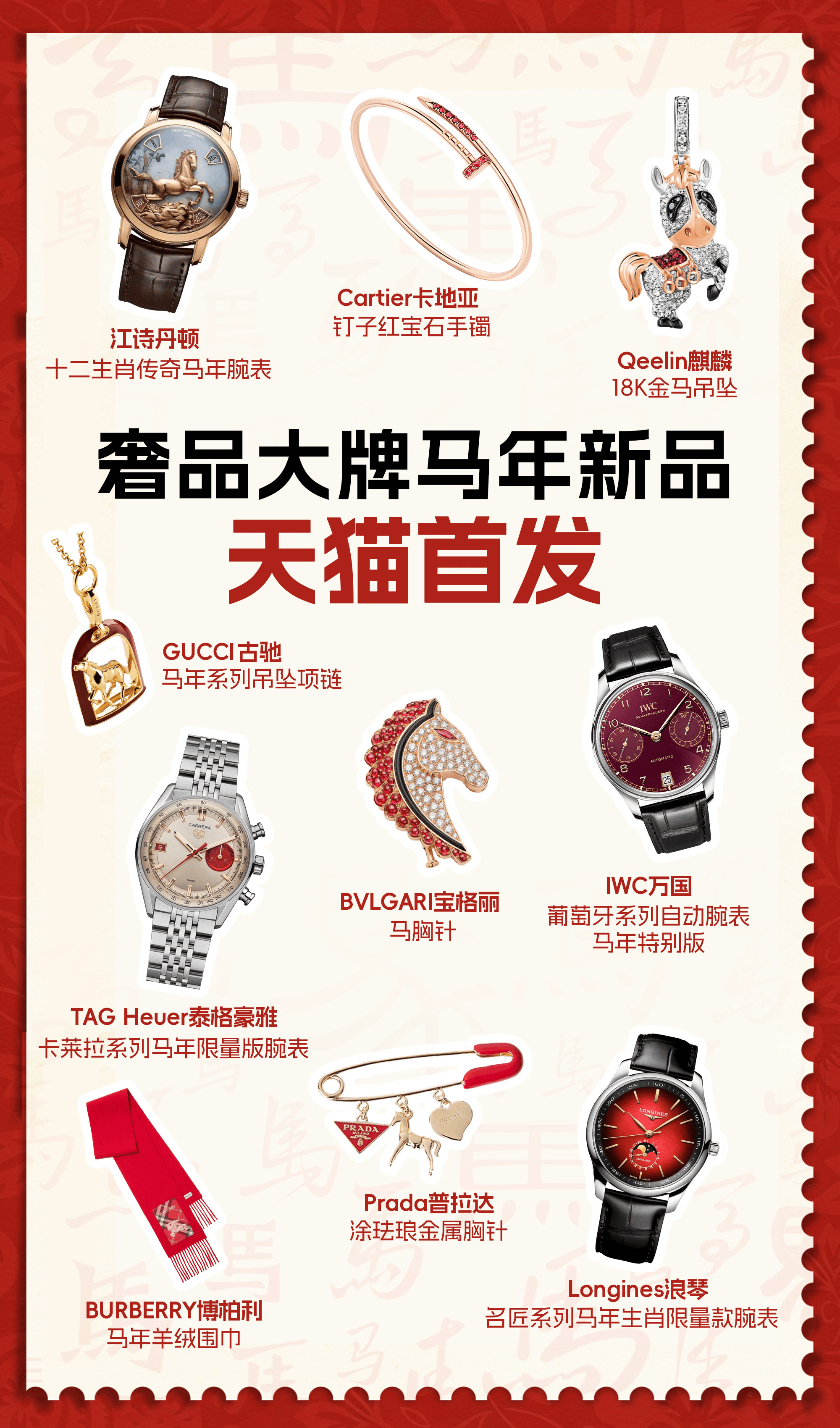 官方网站天猫年货节期间,江诗丹顿、卡地亚、GUCCI古驰、BVLGARI宝格丽、BURBERRY博柏利等全球200家奢侈品牌集中上新马年新品,超过1万款马年生肖限定款、农历新年新品在天猫首发。