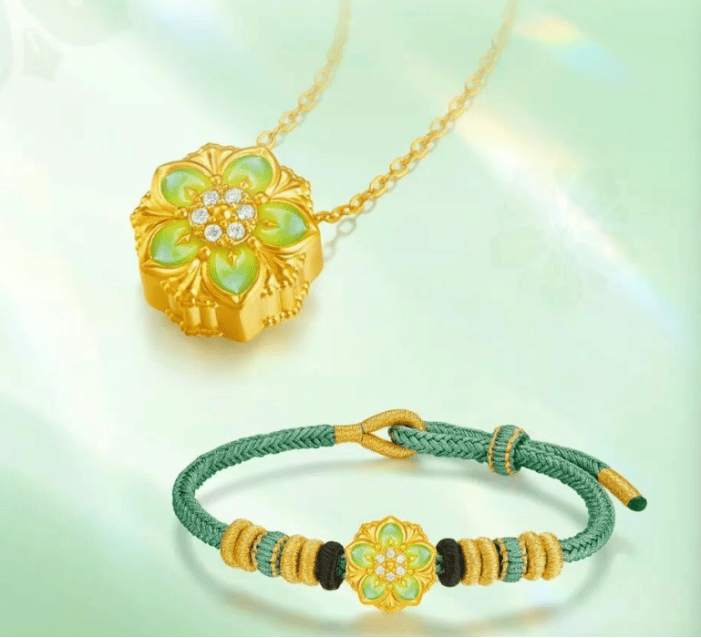 老凤祥“金玉满堂”系列新品以中国传统意象中的海棠花为设计灵感,巧妙融合多项传统工艺与现代创新技法,赋予每一件作品深厚的文化内涵与独特的视觉美感。手链采用鎏彩工艺,使海棠花瓣呈现出由浅至深的铜绿色渐变效果,宛如春日新芽初绽,生动传递出草木萌发的盎然生机。花瓣造型精雕细琢、层次分明,不仅增强了整体的灵动感,也为佩戴者留下鲜明的视觉记忆点;项链吊坠背面运用拉丝工艺,营造出细腻哑光质感,在提升黄金材质高级感的同时,实现了“一款两戴、男女同款”的实用设计,满足多元化的佩戴场景与审美偏好。花蕊部分镶嵌天然钻石,并通过黄金点钻工艺强化视觉焦点,与铜绿色花瓣形成鲜明对比,既突显华贵气质,又不失艺术平衡。